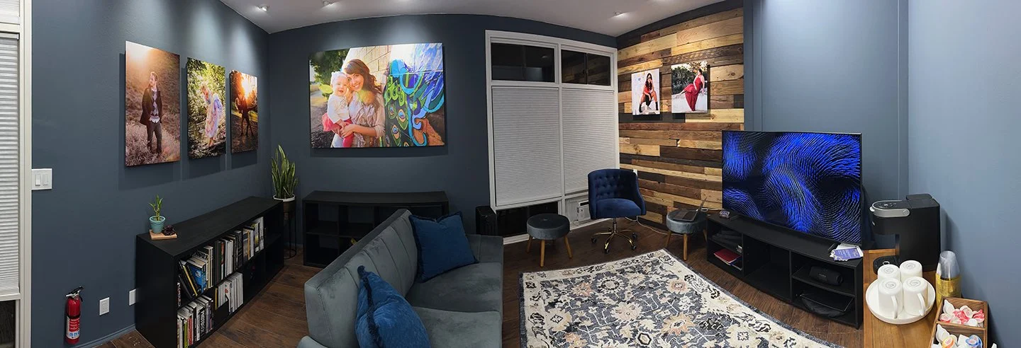 The seating area, complete with a couch, stools, and chairs, faces a 65-inch TV where your images will take center stage. Behind you, several striking metal prints line the walls, from intimate 20x20s to a bold 40x60 statement piece. These samples give you a sense of scale and finish, but in the reveal, the spotlight shifts entirely to you and your images.